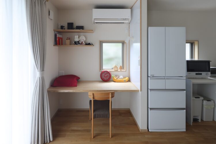 好きな寸法で作ることができ、本棚や収納を合わせて造作するのもおすすめです。