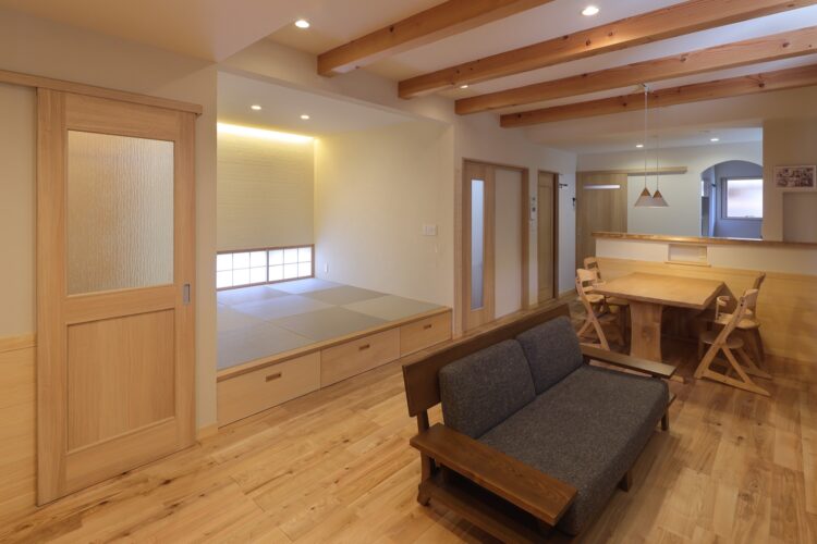 小上がりの畳コーナーは子どものお昼寝、遊びスペースなどとして使える多目的空間です。間仕切りをつければゲストルームにも変身するのでとても便利です!
