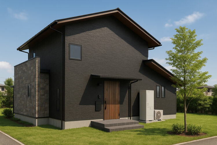 黒の深みと青の彩りが、四季の景色に映える家になっています。