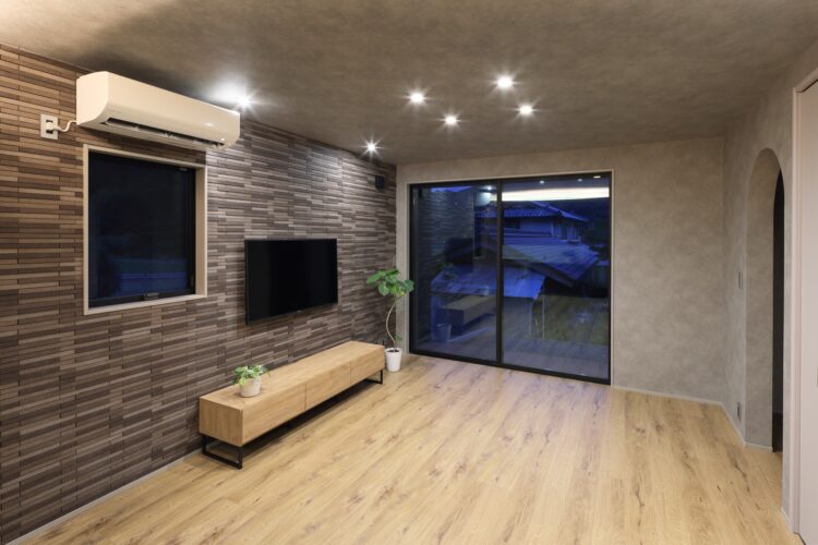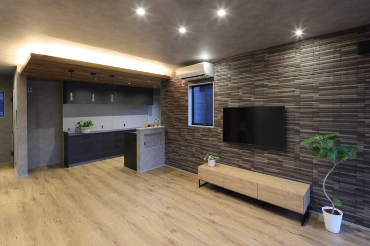 テレビ側壁面にはシックな色調のタイルを採用。落ち着いた雰囲気を演出しています。