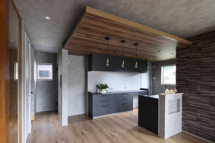 外観は黒を基調とした落ち着いた外観に、木目調の軒天でモダンな印象に。